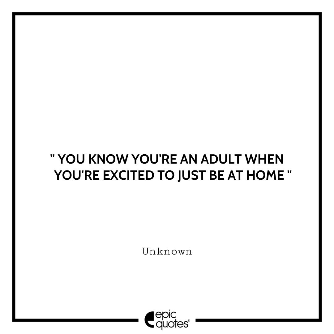 Categories Epic Quotes MainYou know you’re an adult when you’re excited to just be at home Post author By Tanya Suyal Post date May 3, 2022 You know you're an adult when you're excited to just be at home” You know you’re an adult when you’re excited to just be at home “ Lets be social: 1.4M+ Fans 450K+ Followers Tags Epic Quotes, Funny Quotes, Inspiring, Life, Life Quotes, quotes ← 15 Song Quotes That Will Make You Fall In love A Little Bit Harder → Sometimes it takes only one act of kindness and caring to change a person’s life Related articles Sorry I’m Late, I was Hoping the Plan Would be Canceled Don’t cry over what has happened; great things are ahead Kindle, paperbacks, or do you not read at all? Is it just me or does everyone have a second dinner? What’s your first thought every morning after waking up? I miss my lost friendships more than anything else