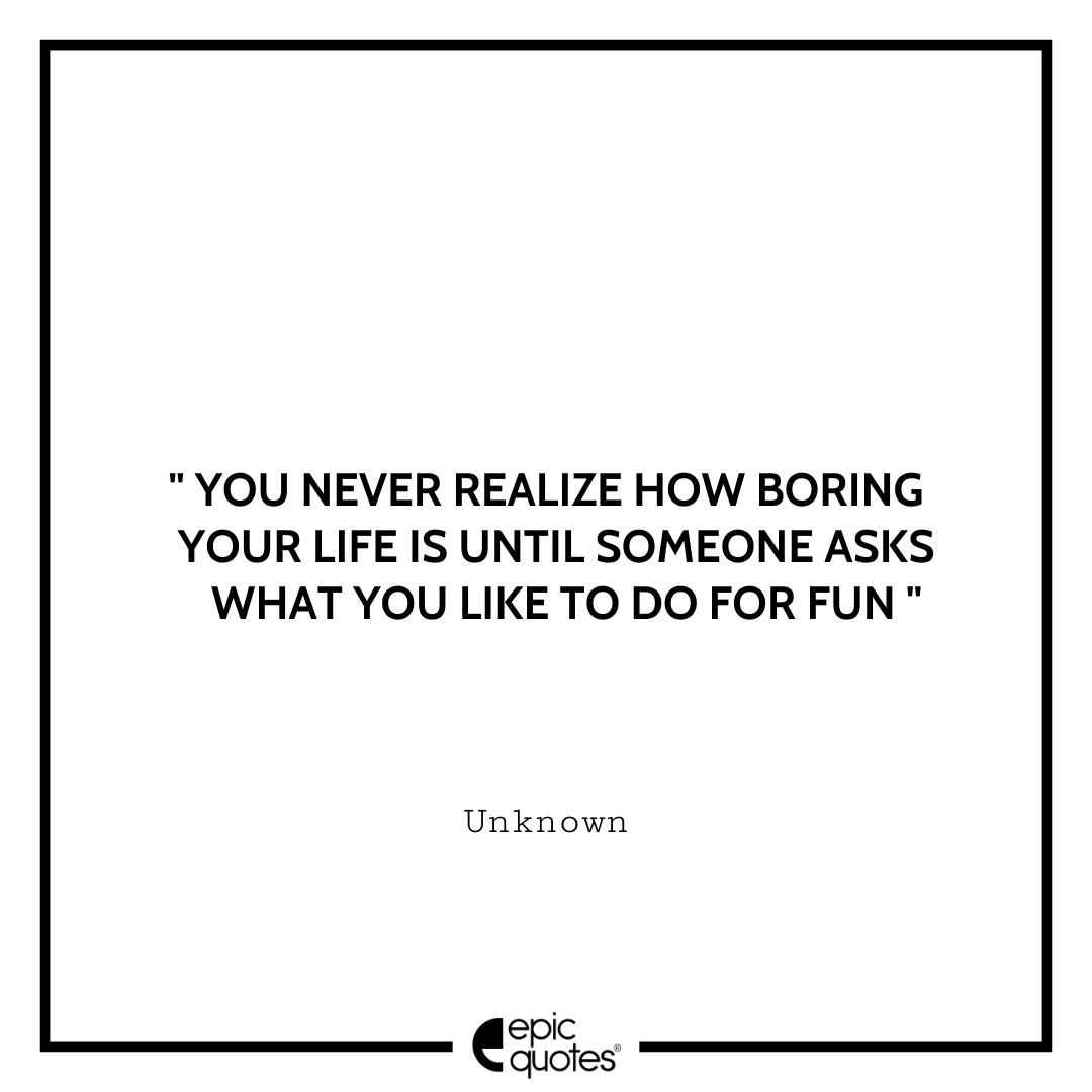 Categories Epic Quotes MainYou never realize how boring your life is until someone asks what you like to do for fun. Post author By Tanya Suyal Post date March 7, 2022 You never realize how boring your life is until someone asks what you like to do for fun.” You never realize how boring your life is until someone asks what you like to do for fun. “ Lets be social: 1.4M+ Fans 450K+ Followers Tags Epic Quotes, Funny Quotes, Inspiring, Life, Life Quotes, quotes ← 12 Most Romantic Golden Time Quotes Of All Time → 20 Iconic Quotes From Robert Pattinson’s The Batman (2022) Related articles Sorry I’m Late, I was Hoping the Plan Would be Canceled Don’t cry over what has happened; great things are ahead Kindle, paperbacks, or do you not read at all? Is it just me or does everyone have a second dinner? What’s your first thought every morning after waking up? I miss my lost friendships more than anything else