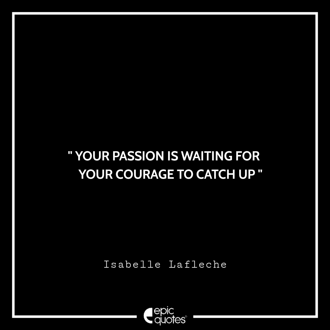 Categories ThursdayYour passion is waiting for your courage to catch up. –Isabelle Lafleche Post author By Shubham Post date April 1, 2022 Your passion is waiting for your courage to catch up. –Isabelle Lafleche” Your passion is waiting for your courage to catch up. –Isabelle Lafleche “ Lets be social: 1.4M+ Fans 450K+ Followers ← Whatever you are, be a good one. -Abraham Lincoln → If something is important enough, even if the odds are stacked against you, you should still do it. –Elon Musk Related articles Life is about making an impact, not making an income. -Kevin Kruse The miracle is not that we do this work, but that we are happy to do it. –Mother Teresa If something is important enough, even if the odds are stacked against you, you should still do it. –Elon Musk Whatever you are, be a good one. -Abraham Lincoln The only person you should try to be better than, is the person you were yesterday. -Unknown I attribute my success to this: I never gave or took any excuse. –Florence Nightingale